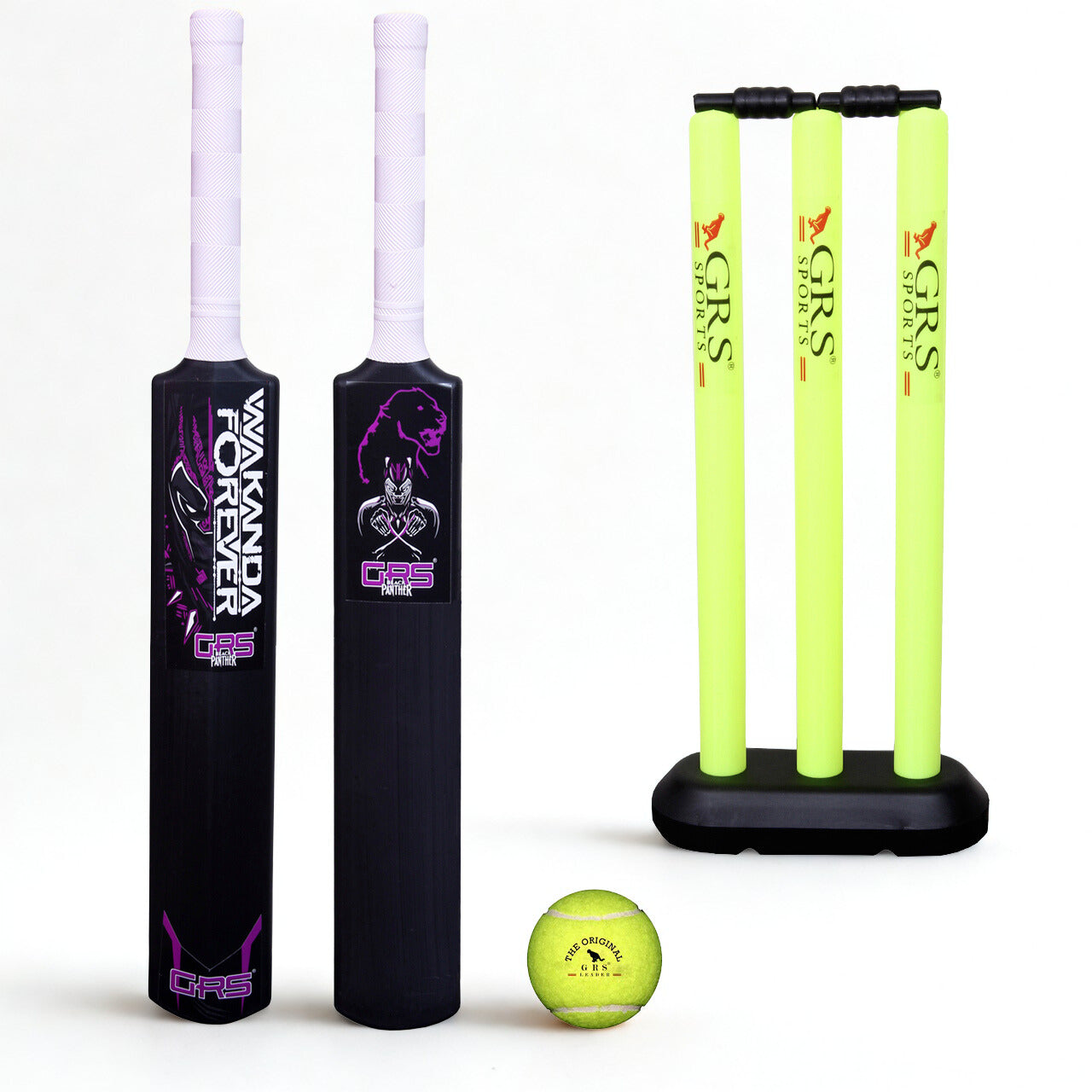 GRS Wakanda-Forever Heavy Grade Hard Plastic Cricket Bat with Wicket Set Floro & 1 Tennis Ball for Kids (Size 3, Age 6-10 Year Old Kids), Strong Plastic